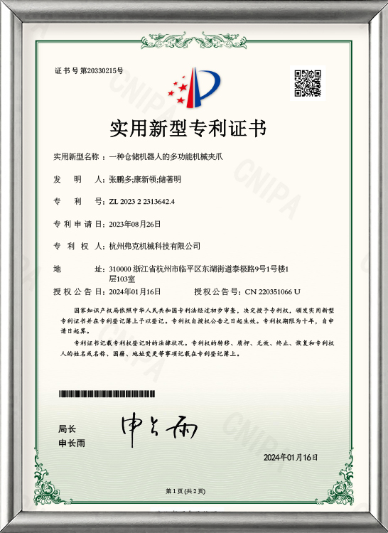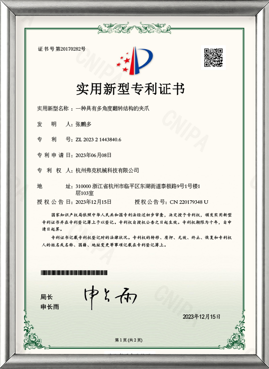 An Industrial Robot Gripper - Utility Model Patent Certificate