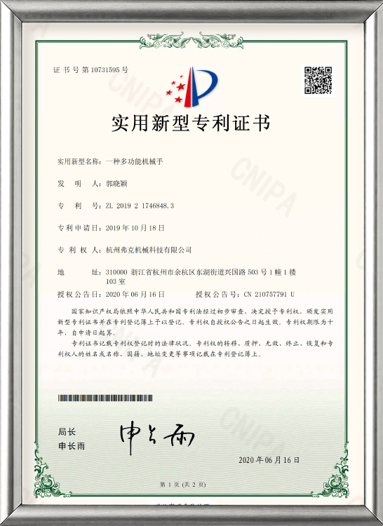 A Multifunctional Robotic Hand - Utility Model Patent Certificate